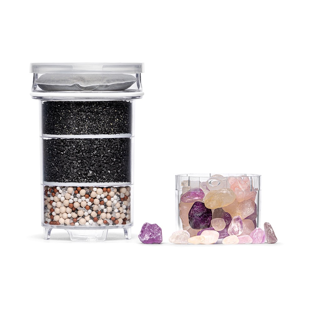 Die erste Kammern enthält Aktivkohle und Ionentauscher zur Reduzierung von Kalk, die zweite Kammer mit Aktivkohle fungiert als Filter für Schwermetalle, und die dritte Kammer enthält eine Zusammenstellung aus Magnesium, Kalzium, Turmalin und weiteren spezielle Keramiken mit hohem Mineralgehalt – diese Wasserfilter-Technologie von Lotus Vita nennt sich PiVitalis®. Die Mineralzusammensetzung macht Ihr Wasser besonders schmackhaft und leicht zu trinken.